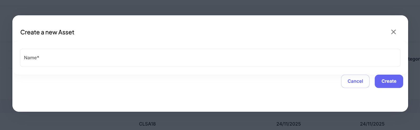 Select Create new Asset in the top-right corner. A modal window will appear.