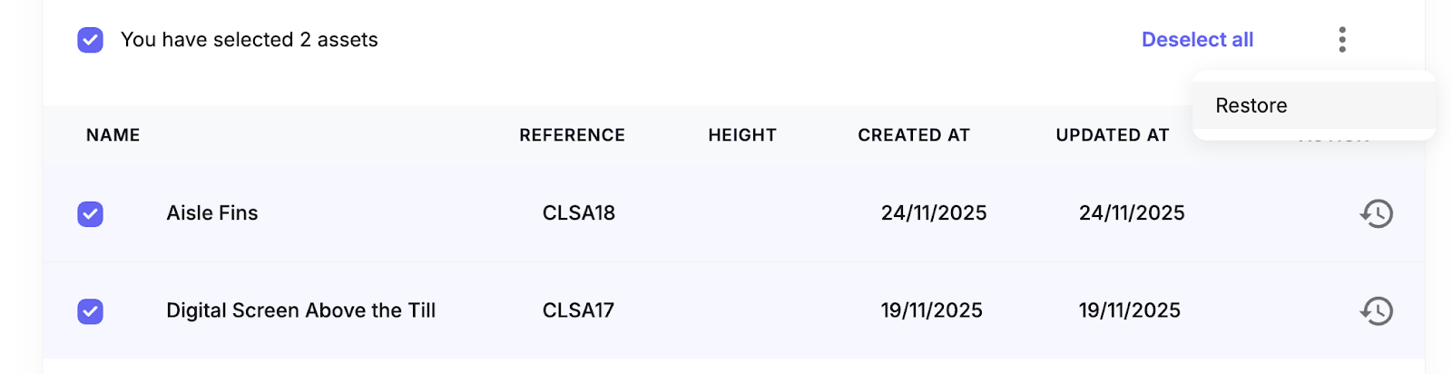 Select the Asset(s) you wish to restore and click the checkbox next to the Asset name.