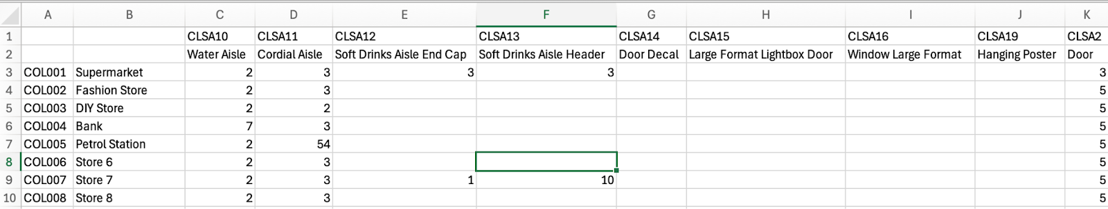 Open the file and populate the spreadsheet by entering the desired quantity for each Asset at each Location.