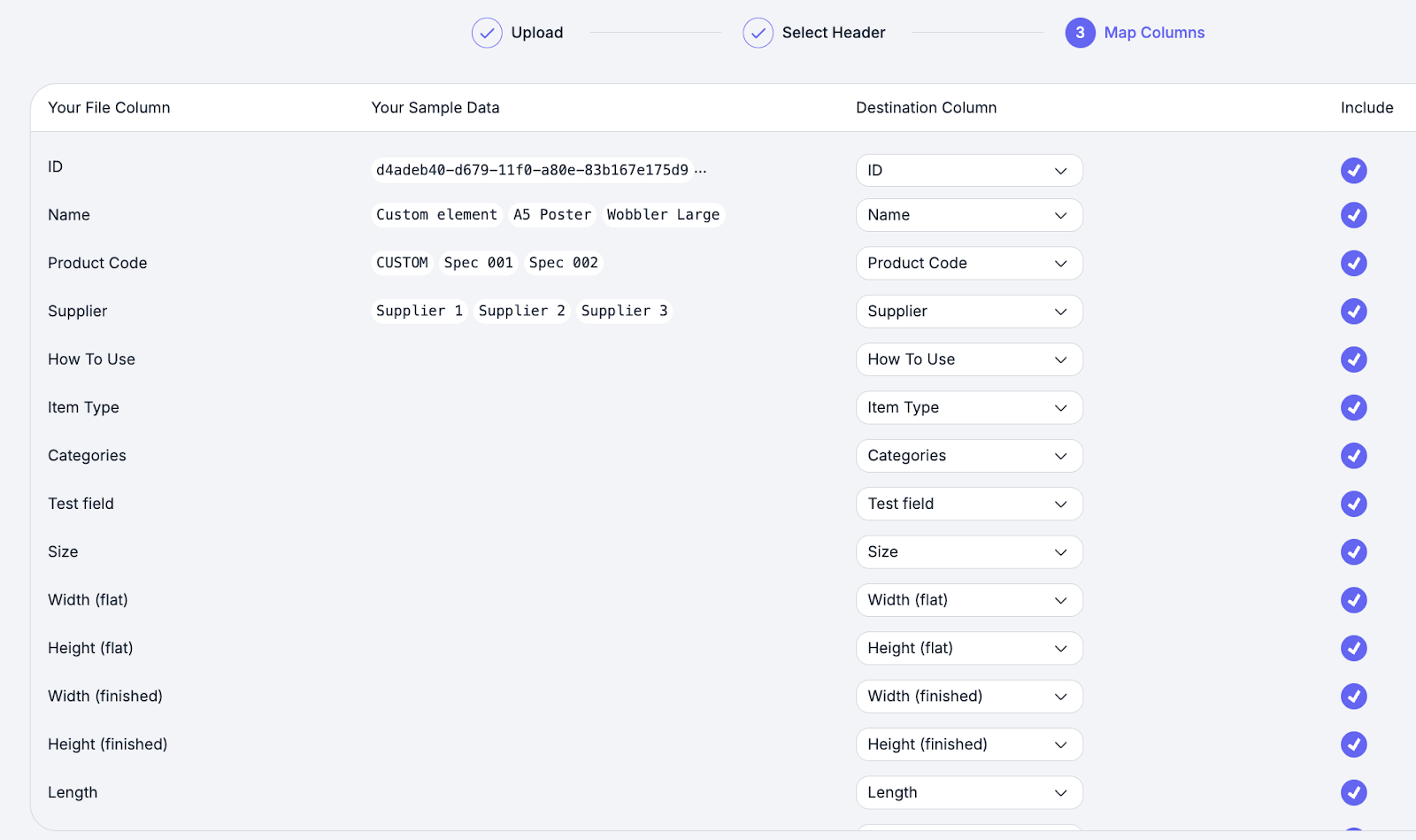 Map your CSV columns to system fields (e.g., match "Supplier" to "Supplier*").